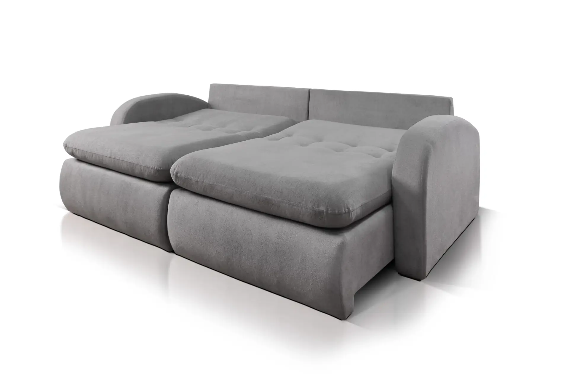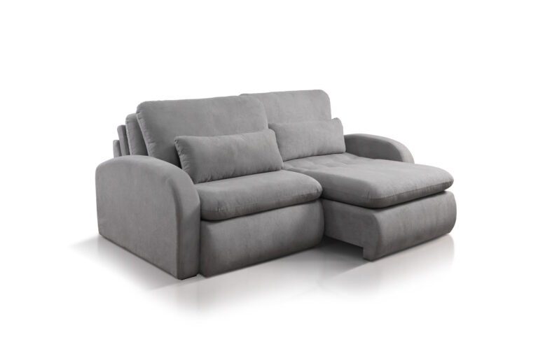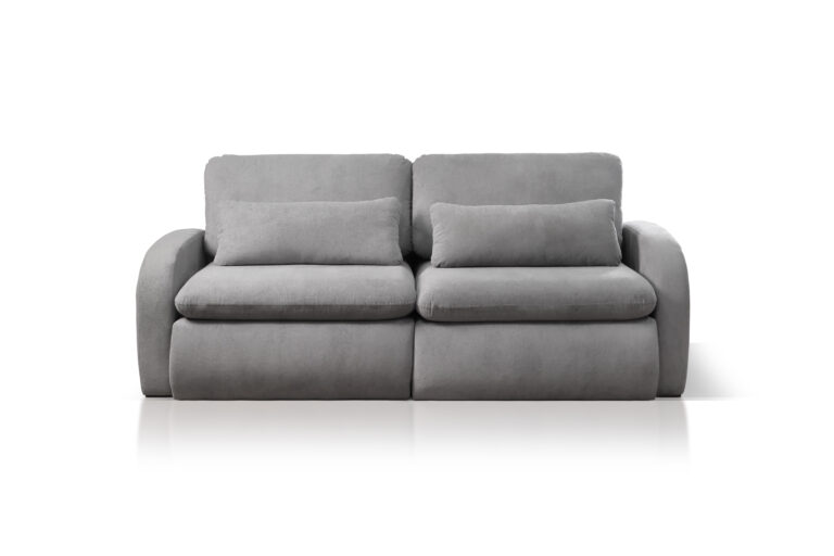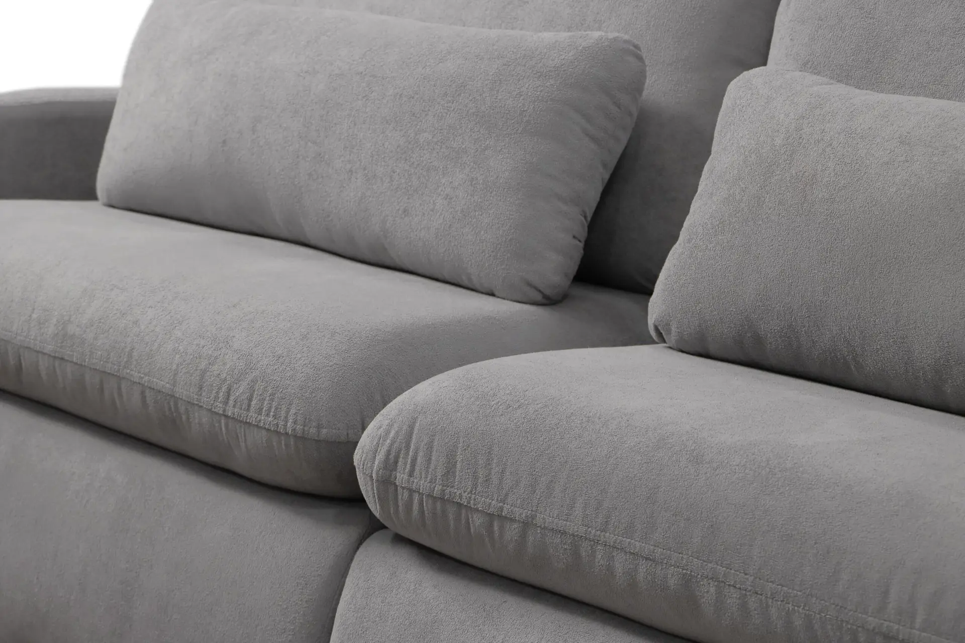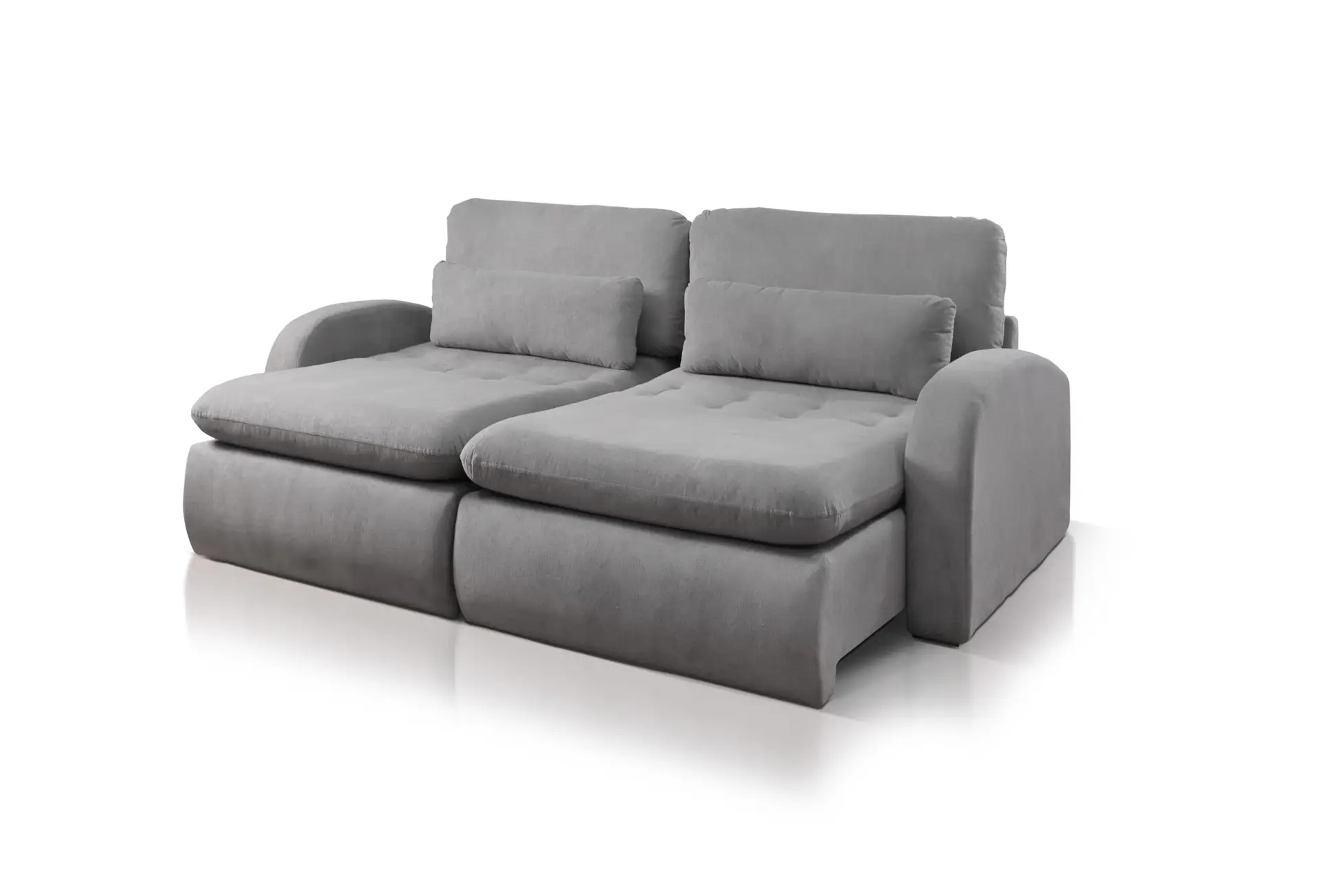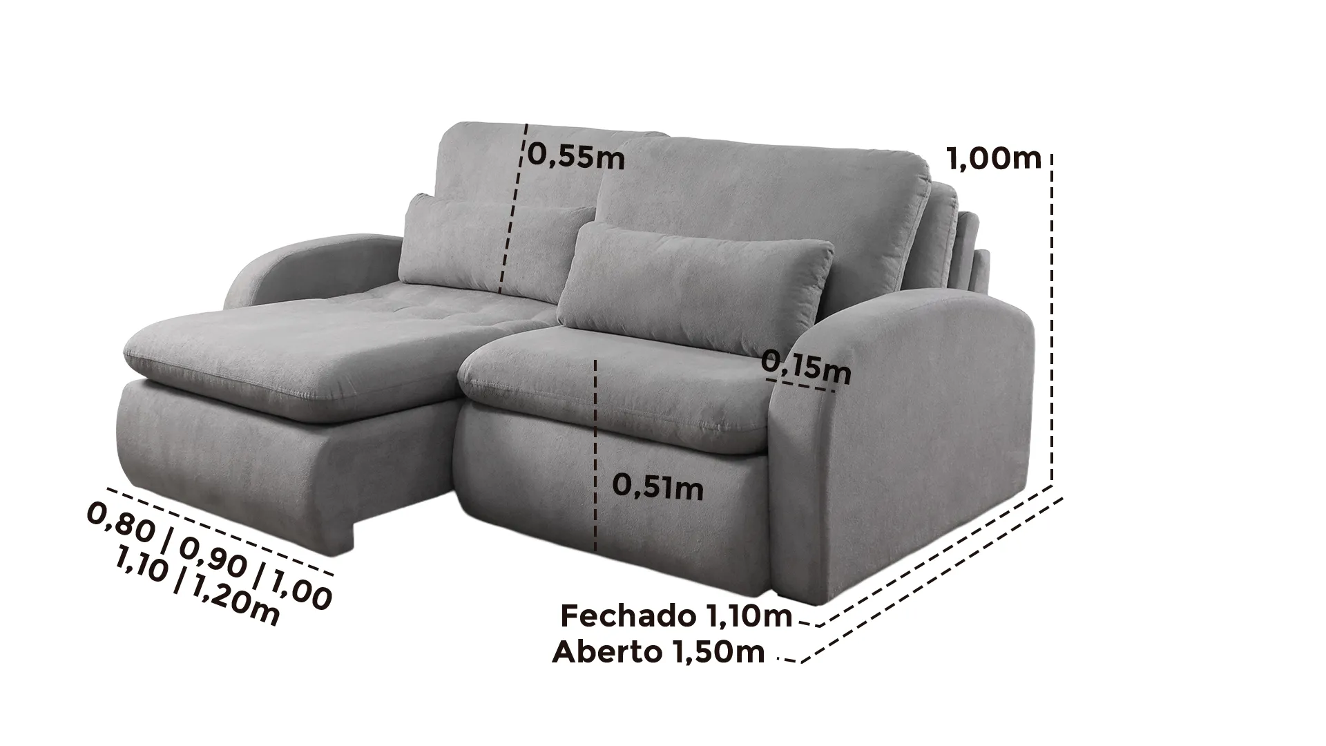 Encosto reclinável com função cama, ampliando a funcionalidade e o uso do sofá em diferentes situações.