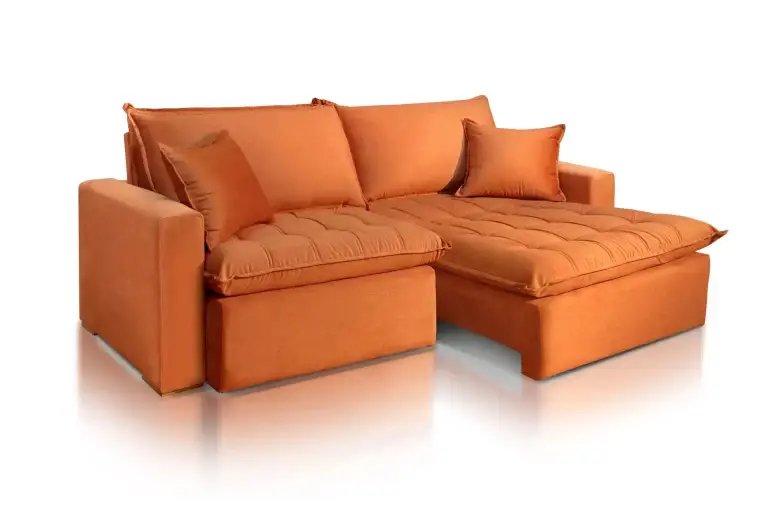 Encosto reclinável com função cama, ampliando a versatilidade do sofá para diferentes momentos de uso.